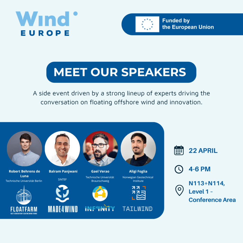 In this article, we introduce the speakers who will be presenting at the “Designing the Future of Floating Offshore Wind: Innovation, Sustainability, and Societal Impact” side event during Wind Europe 2026. Find all the details about this key event for our wind energy cluster: FLOATFARM at Wind Europe 2026 in Madrid – Floatfarm